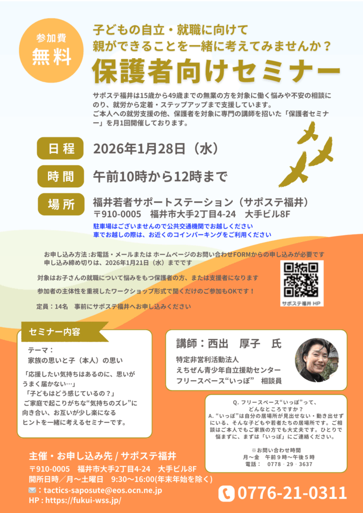 嶺北/サポステ福井(0776-21-0311)、嶺南/嶺南サテライト(070-1301-0266)まで!